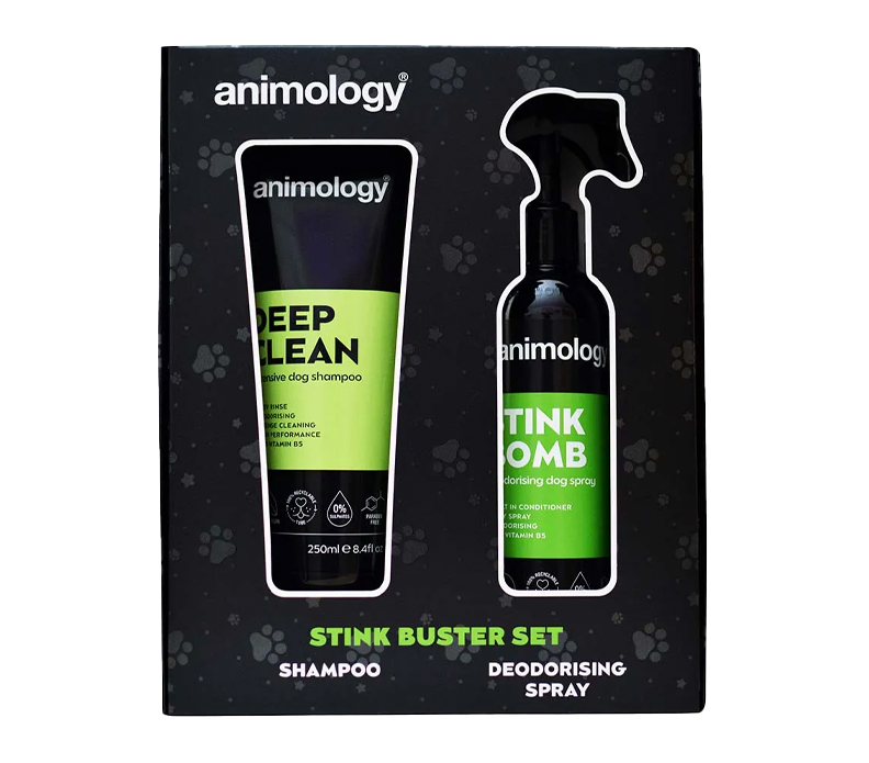 Animology Stink Buster Set helps to banish those waggy whiffs and puppy pongs that can sometimes make cuddle time a challenge! Our Deep Clean Shampoo penetrates the coat and targets stubborn dirt and odours, leaving even the thickest coats beautifully clean and fresh. Paired with our Stink Bomb Deodorising Spray, which is specially formulated to target & help neutralise any lingering odours, this dynamic duo is the perfect solution to keep your pooch snuggle fresh at all times!