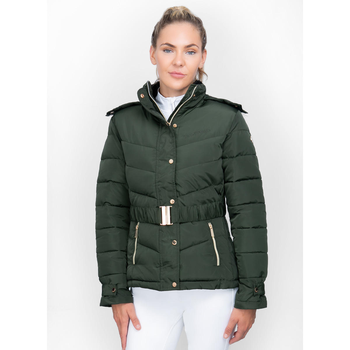 The stunning Cornhill Quilted Coat is engineered with quilted luxury faux duck down panels ensure optimum insulation, by trapping warm air to create a snug feeling. The detachable premium faux fur around the hood and faux fur on the collar to not only look stylish but keeps you toasty in the cold weather. This gorgeous coat features detachable premium faux fur around the hood and faux fur on the collar to keep you toasty and a flattering belt to secure the coat and creates a tailored shape and silhouette. The rear zipped vents allow for this coat to be used easily when riding, so you can look on-trend and be comfortable in and out the saddle. Exquisite gold detailing finishes off this stylish item, including a two-way front zip, press studs, zipped pockets and subtle Coldstream badge to the arm. As with any signature Coldstream piece, you are guaranteed supreme style and performance with this deluxe garment.