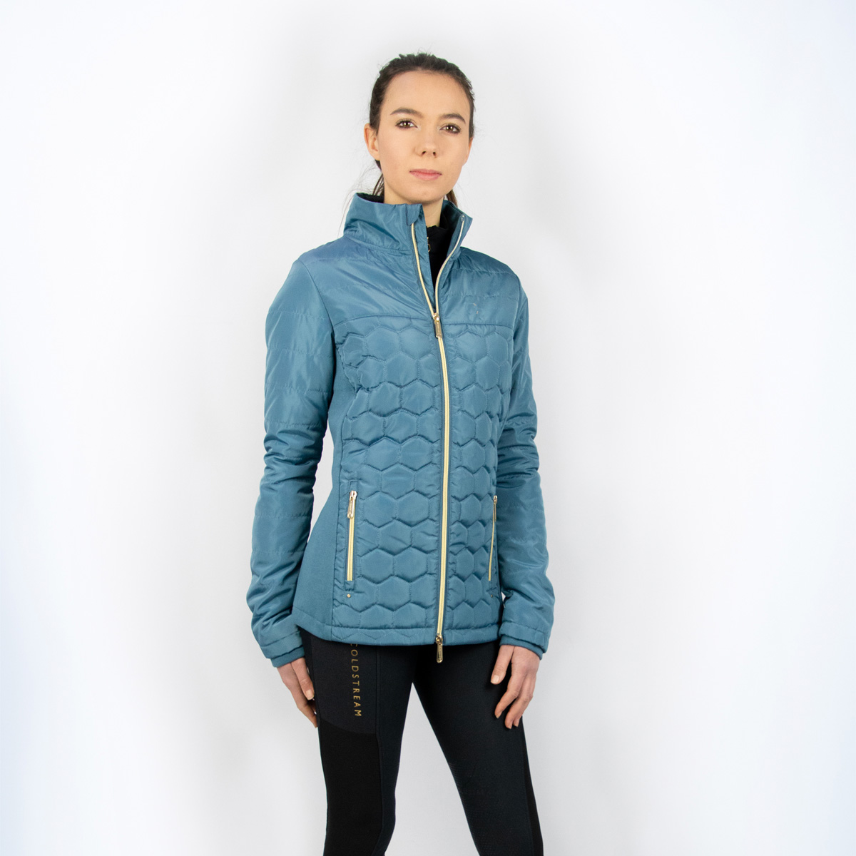 The Linton Lightweight Jacket is a smart and stylish piece, ideal for days competing or training, or to even save for best. The hexagonal quilted body and straight quilted arms are lightly padded using a faux duck down. Down clusters trap pockets of air, which in turn trap heat from your body, giving you the comfort and insulation you need. Side panels designed using stretch jersey material lined with fleece not only optimises warmth and snugness, but also creates a flattering silhouette. The advanced Lycra storm cuffs feature thumb holes and offer a snug and tailored fit whilst protecting the wearer from the wind. Exquisite and subtle Coldstream detailing including a gold metal badge to the back collar, debossed leather badge with diamantés to the chest and tonal matte silicone on the arm create a polished finish. Completed with luxury gold hardware, including practical 2-way zip and 2 practical front zipped pockets, this statement jacket is an essential addition to any athlete's wardrobe.