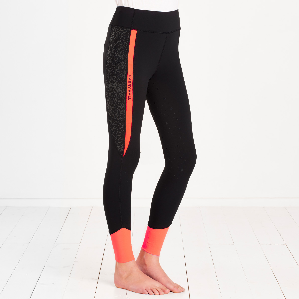 The perfect pair of riding tights to keep every junior rider comfortable and seen in the saddle. Lightly brushed back finish for extra comfort against the skin, a functional form fitting four-way stretch fabric, comfortable and supportive high waistband there is no compromise on flexibility or freedom of movement during every wear. These riding tights remain lightweight and soft offering maximum comfort, with a full silicone seat for that little bit of extra security when in the saddle. Featuring a bright orange Hi Viz panel and a reflective print to add some visibility to your child's riding attire to help them be safe and seen when out on the roads. Designed with elasticated ankle panels to help reduce bulk and keep comfort a priority when worn with riding boots. Side pocket suitably sized for most mobile phones or snacks and pony treats! Finished with Harry Hall branding on the waistband and leg in a subtle reflective print.