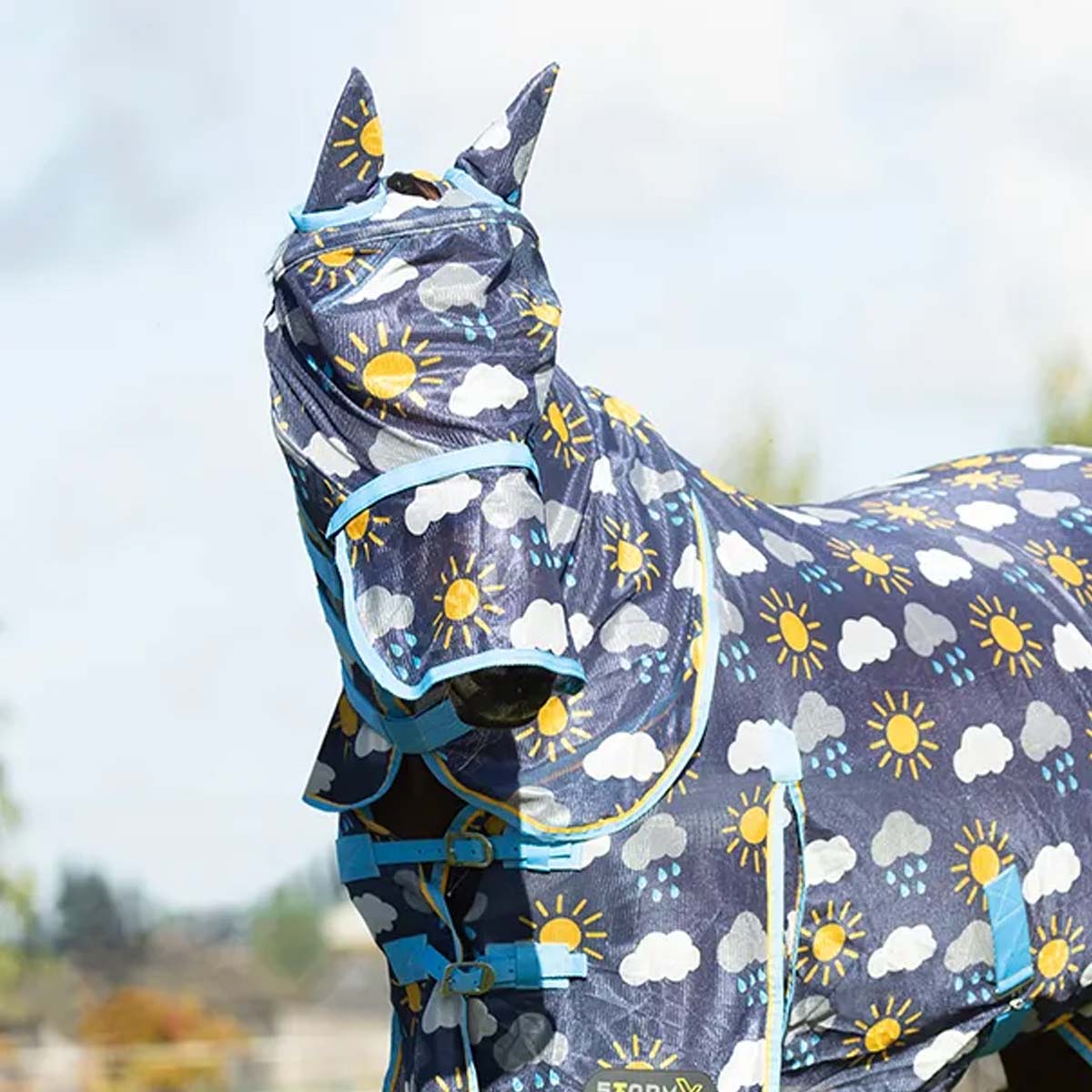 This fly mask is made from a lightweight mesh material that protects the horse whilst allowing optimum airflow. Featuring the bold ‘Come Rain or Shine’ print for an eye-catching look. The touch tape fastenings secure the mask and make it easy to put on and take off, whilst the touch tape nose allows for it to be easily attached and detached as required. Matching fly rug available.