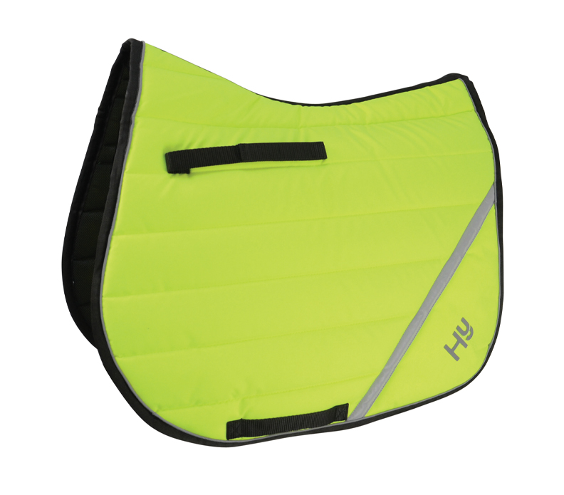 Stay safe and be seen with this high quality Hi-Viz fluorescent yellow saddle pad. Edged in black binding with a reflective silver stripe, piping and Hy logo, this saddle pad really makes a statement when hacking out on the roads. Your horse’s comfort has been catered for too; the saddle pad has high wither clearance and is lined with a soft, breathable mesh to wick away moisture, keeping your horse cool and comfortable. Padded channels help to evenly distribute the pressure and black touch tape fastenings and girth loops match the black binding.