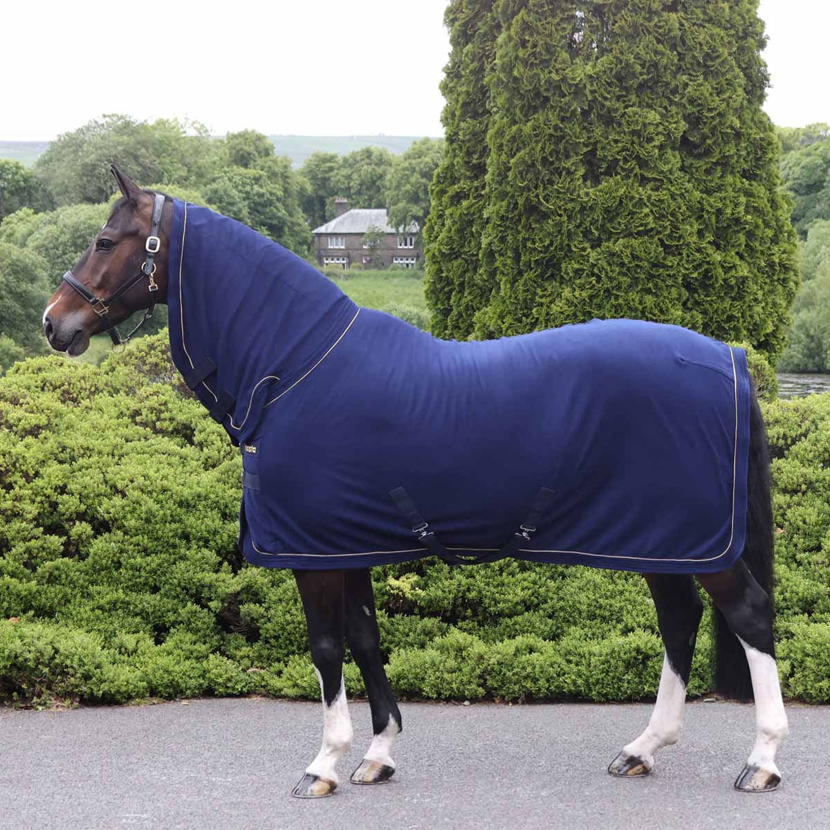 The Masta Fleece Rug Combo Neck is made from breathable, wicking fleece fabric with a soft anti-pill finish. Ideal for travelling, in the stable, after bathing or for cooling down after exercise. Featuring twin surcingle fastenings to the front, adjustable cross surcingles on the belly and a fillet string. Finished with metallic gold piping and a wide binding with stitch detail for a stylish finish. The natural wicking properties of the fleece fabric make this rug Ideal for after bathing or for cooling down after training, helping to prevent chilling after exercise. The anti-rub lining at the chest and fleece wither collar reduces any unwanted pressure or rubbing making this versatile rug also suitable as a stable sheet or travel rug.