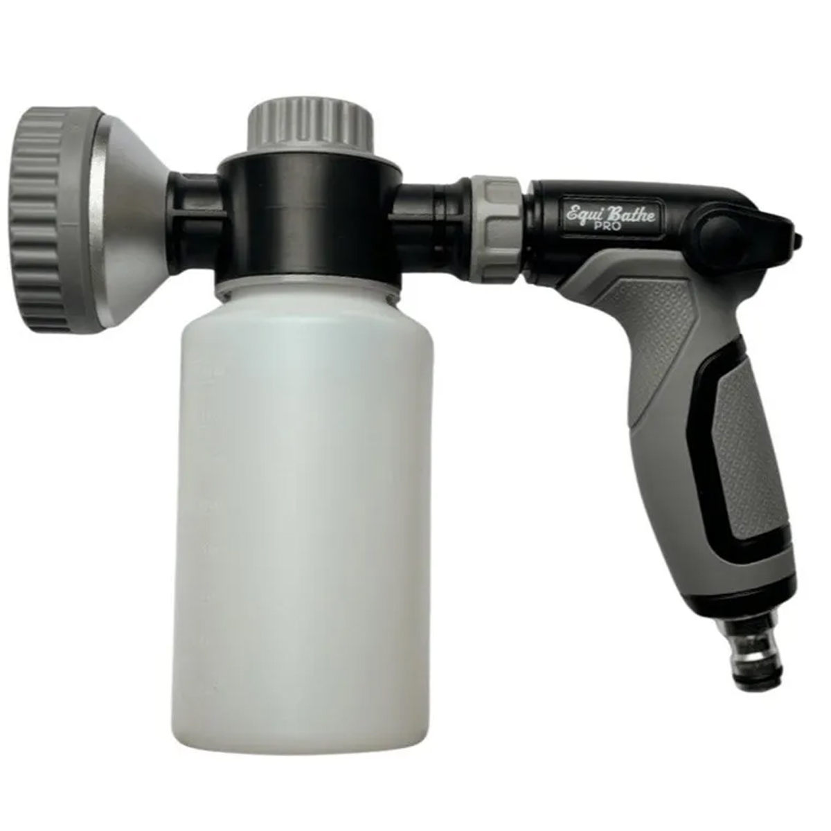 Wash your horse quickly and easily with the Equi Bathe PRO. Easy to use, making washing your horse an enjoyable experience. A spa for your equine. Long-lasting and very durable. Increases water pressure, making it great for cleaning your kit, lorries, and trailers. Professional quality fittings for fewer leaks, wide neck bottle makes filling easy. Works with any type of shampoo.- One-handed operation on/off. - 7 different spray settings.Comes with a handy drawstring storage bag.