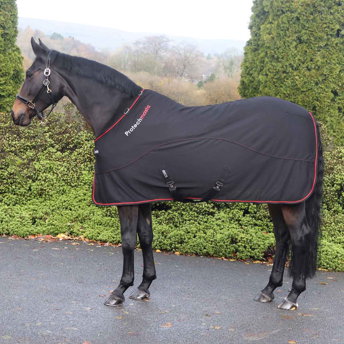 The Protechmasta Far Infrared Therapy Cooler Rug combines FIR technology with lightweight and highly breathable mesh material to create a truly versatile cooler rug. This rug can be used for a multitude of uses from travel, after bathing, before or after exercise or as a lightweight stable sheet. Adjustable front clip fastening and hook and loop closure for a secure fit. Adjustable cross belly surcingle’s and fillet string to secure at the rear. D-ring fittings at neckline to attach optional neck cover (sold separately). The ceramic infused FIR lining features over the back, shoulders, and quarters to help boost circulation. This FIR technology can help to relive muscle tension, sensitivity as well as helping to prepare muscles and tendons for exercise.