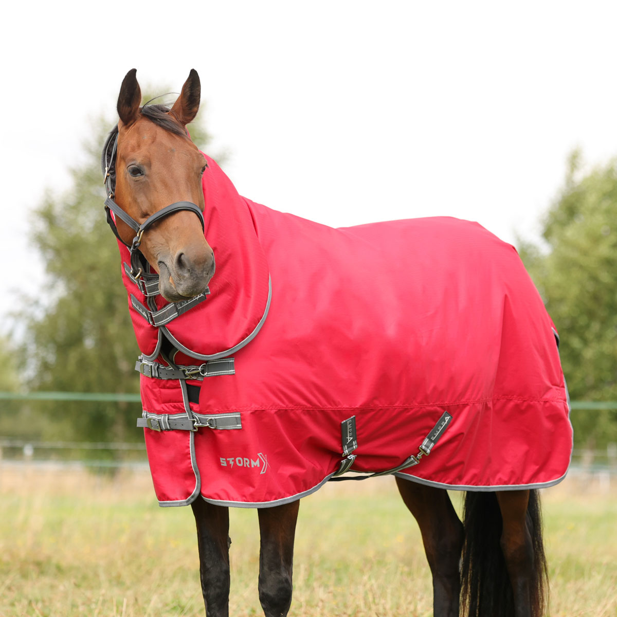 This heavyweight turnout rug offers ultimate warmth for those cold and bleak winter days. The revolutionised StormX Empra turnout rugs are designed using a waterproof and ripstop 600 denier outer material ultimate defence against the elements. This red rug features a 300g fill to keep your horse snug, integrated contour neck cover for extra protection and is lined with a smooth and breathable poly-tec lining to offer optimum comfort. Completed with Empra cross surcingle’s, twin buckle clip chest fastenings and adjustable leg straps to keep the rug securely in place. Finished with reflective StormX logo to help spot your horse or pony on dusky evenings and generous tail flap for extra protection.