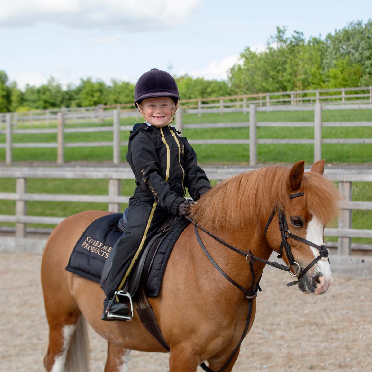 The item every parent has been waiting for! Expertly crafted, this super soft, fleece lined, waterproof children’s onesie, with innovative design has undergone rigorous testing to ensure maximum comfort and performance are delivered. Two full length, two way zips that run parallel to each other and split down either leg, allow for the onesie to be popped on and off in no time at all, with no need to pull over dirty boots or get your child off their pony! Perfect for keeping your little one clean, dry and warm, it is ideal to use at home on the yard, whilst out riding or at competitions. Featuring a hood, suede riding patch, elasticated wrist and ankle cuffs and elastic straps to the bottom of the legs. Beautifully finished with gold detailing, you are not going to know how you ever lived without this onesie!