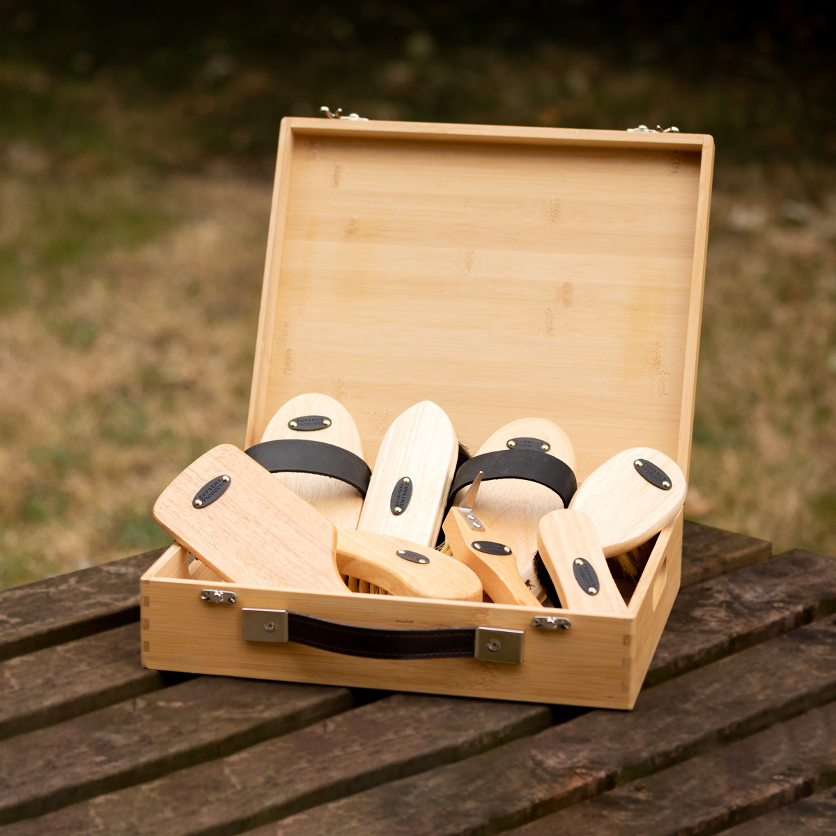The ultimate luxurious grooming box and brush set from supreme products. An ideal gift, this beautiful wooden box features exquisite gold hardware, a leather handle for easy carrying, and is engraved with the three signature Supreme horses. The box contains the full set of gleaming brushes to ensure your horse is kept looking its best. Brushes included are: gleaming coat body brush, dandy brush, flicker brush, finishing brush, face brush, hoof & bucket brush, hoof pick, and mane & tail comb.