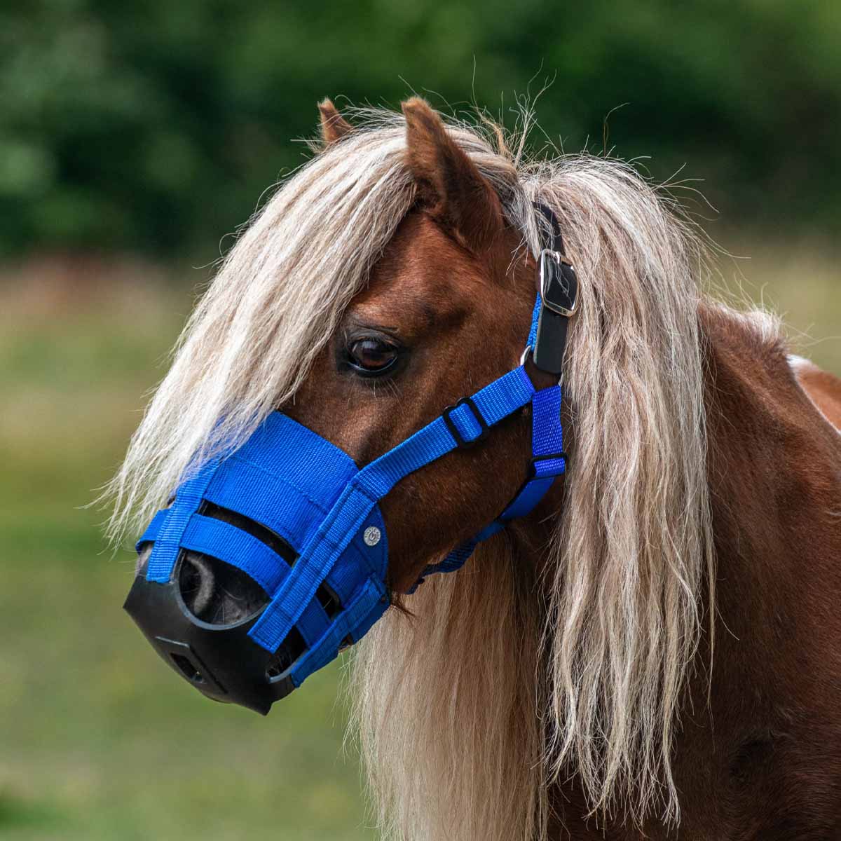 The Ultimate Grazing Muzzle has been designed to help restrict grass intake for horses and ponies who need help with managing weight. Controlling a horses diet is a common issue horse owners come across when it comes to spring and summer months. Studies have shown that horses using a grazing muzzle will consume 50-86% less grass than those without. The Ultimate Muzzle has been made higher at the front to prevent the horse from removing it. The leather headpiece can have extra holes punched in if necessary to make sure the muzzle fits comfortably, with no clips the muzzle minimises the chance of been caught in the field. If your pony / horse is not used to wearing a grazing muzzle, it is advisable to introduce it slowly while they learn to eat with it on. Try putting a little hay or grass through the mouth hole to check the chin is not rubbing at the back. The cheek pieces should be as close to vertical as possible. If they are pulling back at an angle, the muzzle is too tight. *Please note that grazing muzzles should not be worn 24hours a day. When the horse is not wearing the grazing muzzle they should be in the stable with forage provided or in a paddock with non or very little grass.
